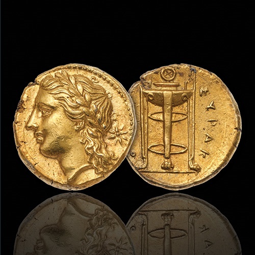 Among the highlights is a spectacular Ancient Greek gold fifty litrai coin from Syracuse, dating back to approximately 310-306 BC, which features a bust of Apollo on the reverse. Coins from the Commonwealth of England are always popular, and among the rarest are those issued with the bust of Oliver Cromwell. We are pleased to offer a gold broad dated 1656; while it is an ex-mount, it remains in very good condition and is difficult to obtain in any grade.