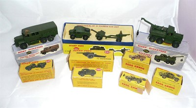 Lot 1256 - Nine Boxed Dinky Army Vehicles - Field Gun Set No.697, Recovery Tractor No.661, Medium...