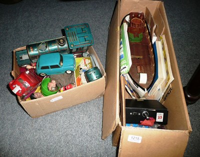 Lot 1215 - Two boxes including radio controlled model boat, tin plate train, toys etc