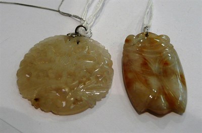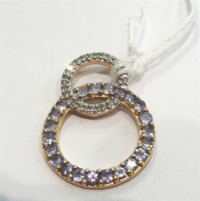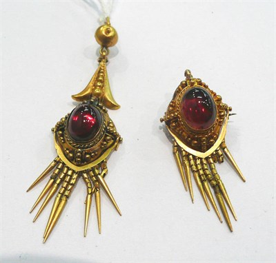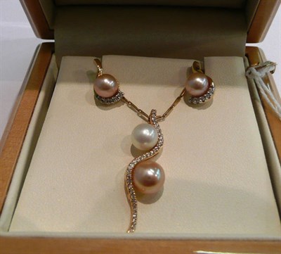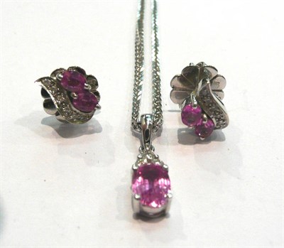 Lot 223 - A pink sapphire and diamond pendant on chain and a pair of earrings