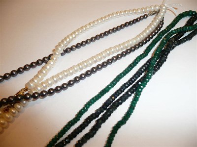 Lot 213 - Two strands of cultured pearls, a strand of faceted emeralds and one of sapphires