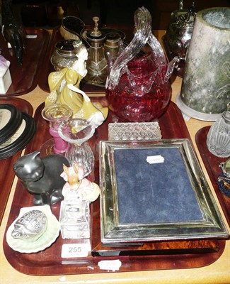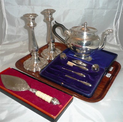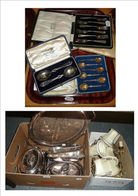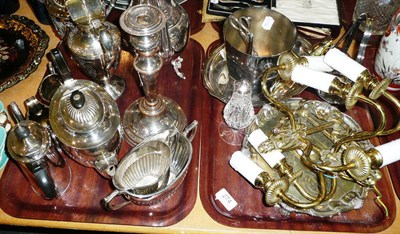 Lot 274 - Two trays of silver plated ware, including tea sets, candlestick, light fittings etc