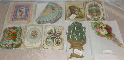 Lot 205 - Nine Victorian Moveable Greeting Cards, including xmas tree, fan, bouquet, aquarium etc