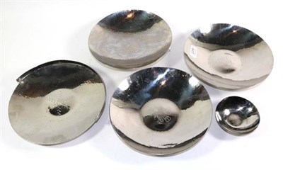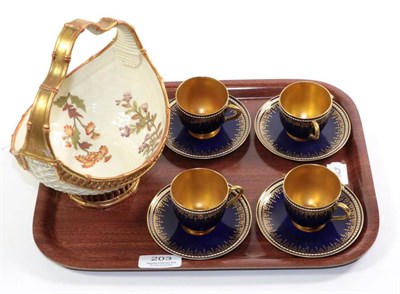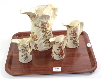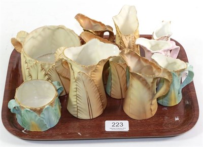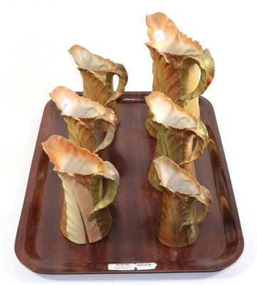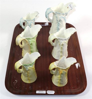 Lot 221 - Six Royal Worcester yellow, green and blue leaf moulded jugs, tallest 18cm
