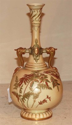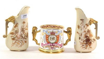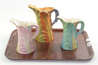 Lot 204 - Three Royal Worcester polychrome leaf moulded jugs, tallest 21cm