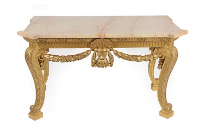 Lot 294 - A Carved Giltwood Console Table, in the style of William Kent, the pink and yellow veined...