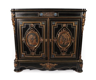 Lot 305 - A French Ebonised and Gilt Metal Mounted Pietra Dura Cabinet, circa 1850, the frieze centred by two